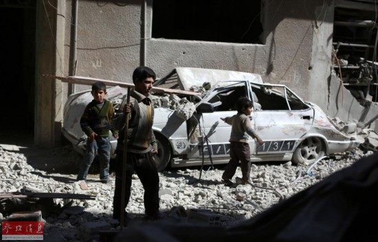 资料图片:叙利亚大马士革以东的反政府武装控制区内,几个男孩在废墟中玩耍。