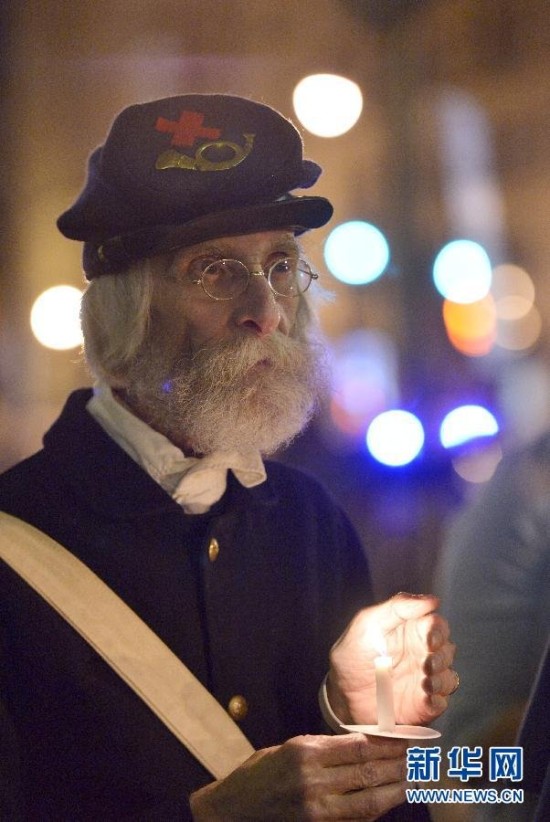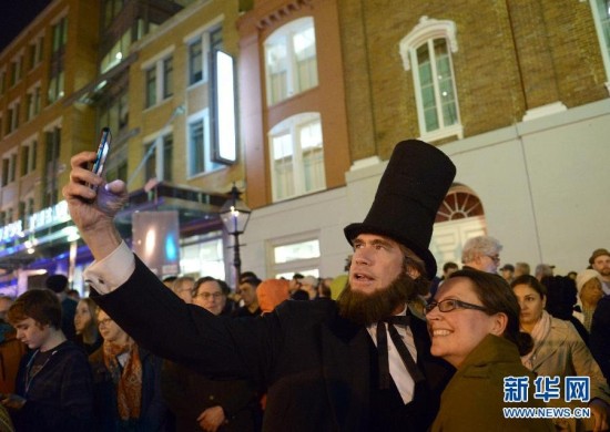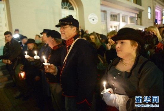 4月14日,在美国华盛顿的福特剧院外,人们身穿复古服装参加纪念前总统林肯遇刺150周年的守夜活动。当日是美国第16任总统林肯遇刺150周年纪念日,华盛顿福特剧院举办一系列活动纪念这位曾在美国历史上发挥过卓越作用的总统。