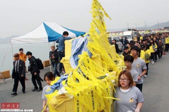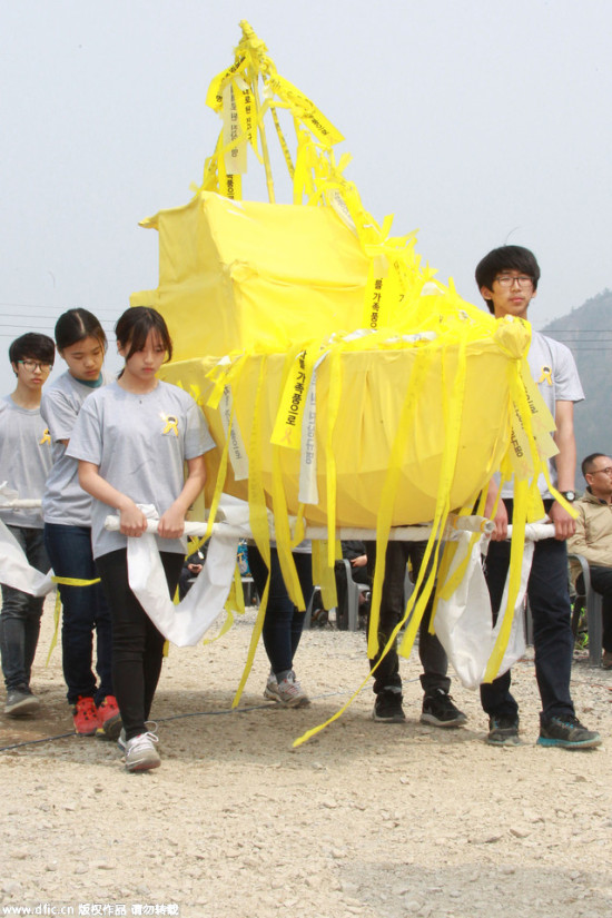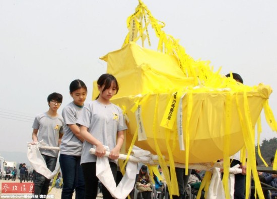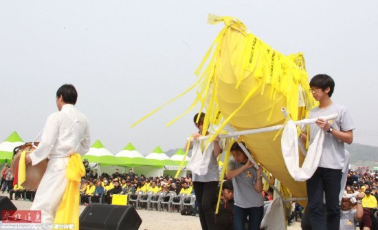 当地时间2015年4月15日,韩国珍岛,“世越号”沉船事故发生1周年的前一天,遇难者家属抬纸船举行慰灵祭。 ??