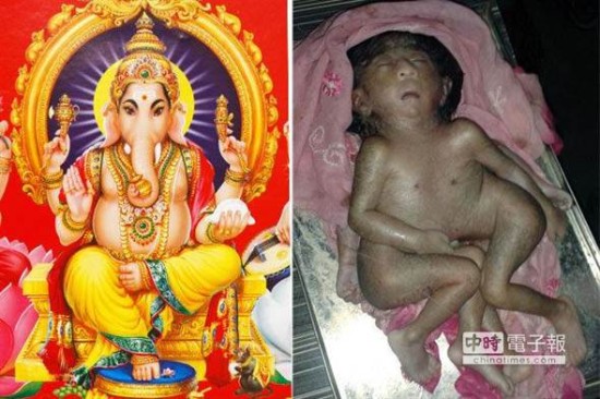 印度婴儿出生(右)因拥有4只手,外形神似印度教的象头神(左),被认为是神明转世,受到膜拜。(台湾中时电子报)