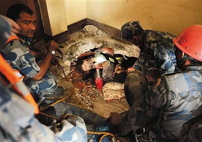 路透社报道,由于加德满都街道大多狭窄,推土机根本无法通行,不少救援人员只好使用简单工具从废墟中挖掘幸存者。