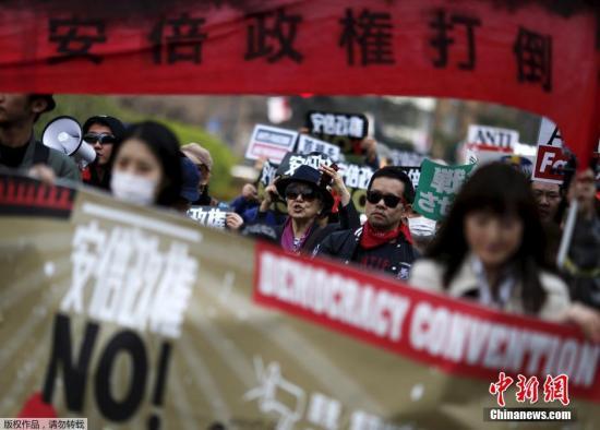 资料图:2015年3月,图为约1.4万人在日本国会大厦周边集会,反对安倍政权推进安保政策及核电政策。