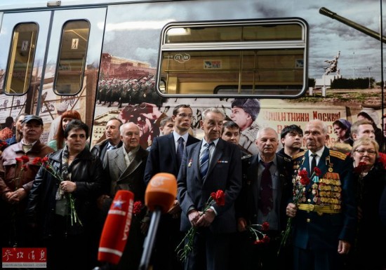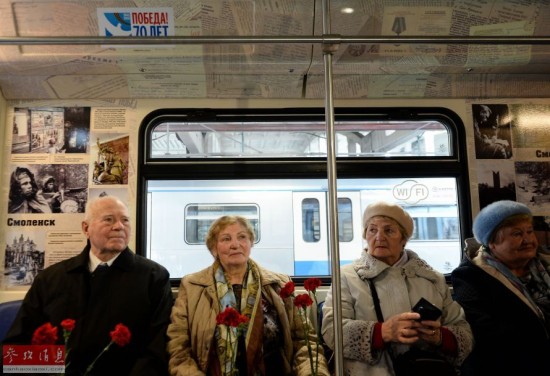 4月22日,在俄罗斯首都莫斯科,首批乘客乘坐卫国战争胜利70周年纪念地铁专列。当日,俄罗斯首都莫斯科卫国战争胜利70周年纪念地铁专列投入运营,卫国战争老兵及莫斯科地铁的建设者等受邀成为首批乘客。新华社记者贾宇辰摄
