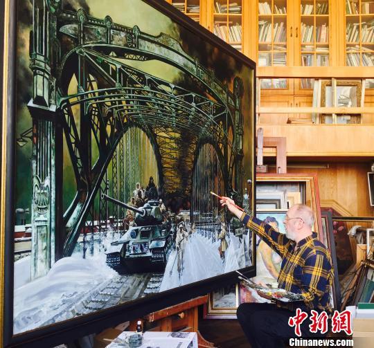 图为俄罗斯人民画家、俄罗斯艺术科学院院士、列宾美院教授安德烈•布里奥克创作巨幅油画《列宁格勒.1943.封锁》。 李霜洁 摄