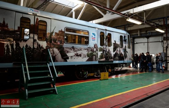 这是俄罗斯首都莫斯科的卫国战争胜利70周年纪念地铁专列(4月22日摄)。当日,俄罗斯首都莫斯科卫国战争胜利70周年纪念地铁专列投入运营,卫国战争老兵及莫斯科地铁的建设者等受邀成为首批乘客。新华社记者贾宇辰摄