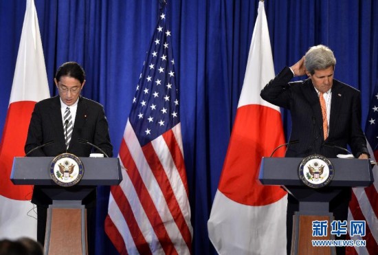 4月27日,美国国务卿克里(右)和日本外务大臣岸田文雄在纽约出席新闻发布会。美国和日本27日在纽约联合发表新版《美日防卫合作指针》,允许日本武装力量在全球扮演更具进攻性的角色。 新华社记者王雷摄
