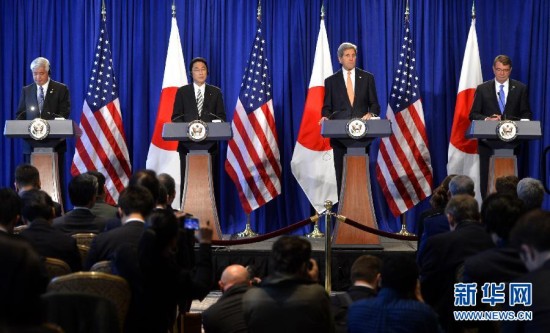美国国务卿克里、国防部长卡特和日本外务大臣岸田文雄、日本防卫大臣中谷元当天在纽约举行外长、防长“2+2”磋商,正式修改《美日防卫合作指针》,大幅扩大了日本自卫队对美国军事行动的支援范围,并将日美军事合作视野从日本“周边”扩展。新版《美日防卫合作指针》规定,当美军遭遇第三国威胁时日本可以前往给予援助,也可以协助美军在中东执行扫雷任务。