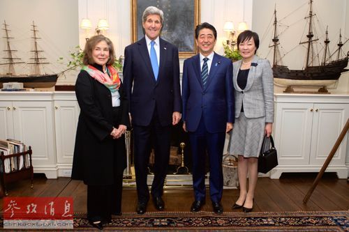 4月26日,克里(左二)夫妇在波士顿家中设宴招待安倍晋三(右二)夫妇。