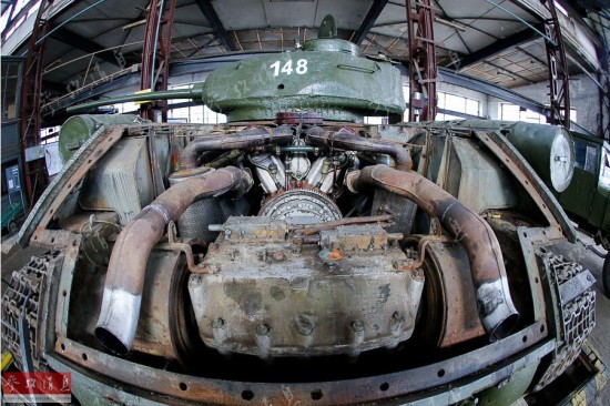 正在整备中的T-34坦克和发动机。