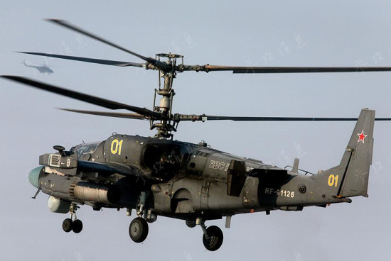 ?飞行中的卡-52直升机,图中可看到机身侧面的30毫米机关炮。