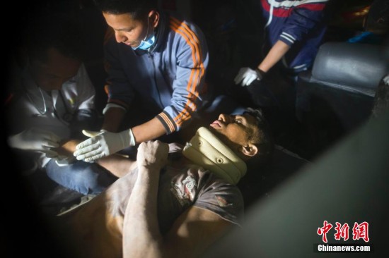 4月29日凌晨0点29分,一名20岁的尼泊尔男子在法国救援队的努力下从加德满都的一座楼房中脱险,在地震发生82小时后生还。图为他上救护车后接受医生检查。 中新社发 张浩 摄