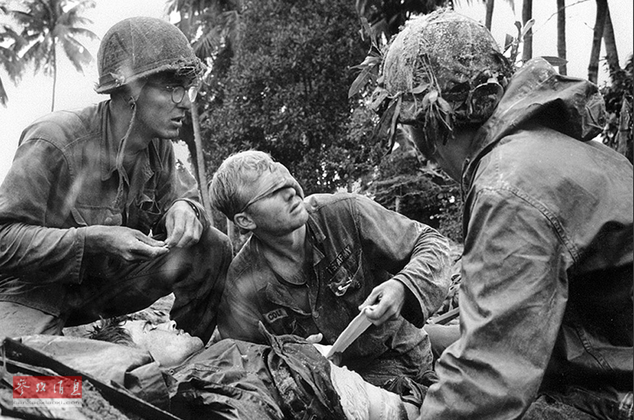1966年1月30日,美军骑兵第1师军医托马斯左侧脸上缠着绷带,看着一个无法分别其身份的士兵。在被美国军队占领前,这个战壕是越共防空防御的第一线。