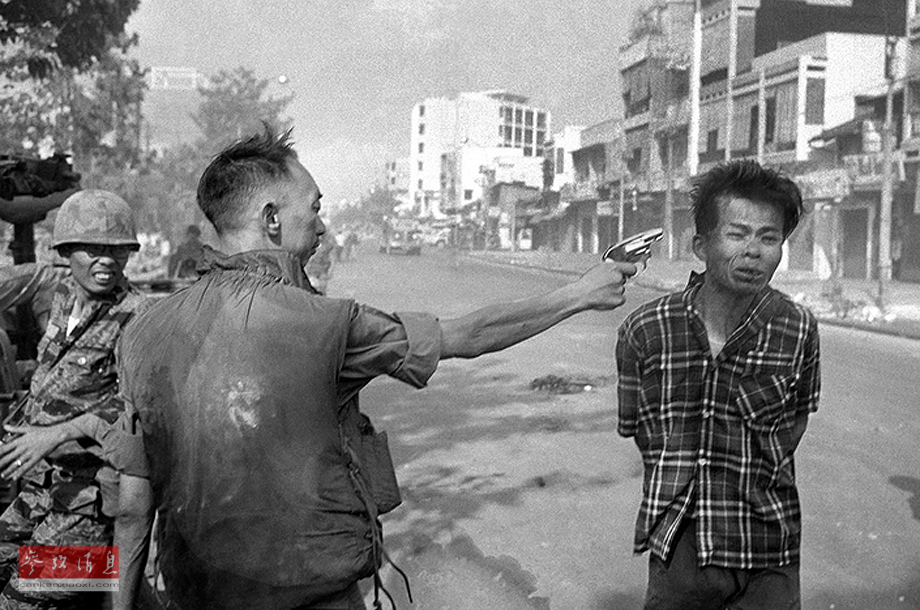 1968年2月1日,南越国家警察局长阮玉湾将军掏出手枪对准越共军官阮文敛头部开枪。