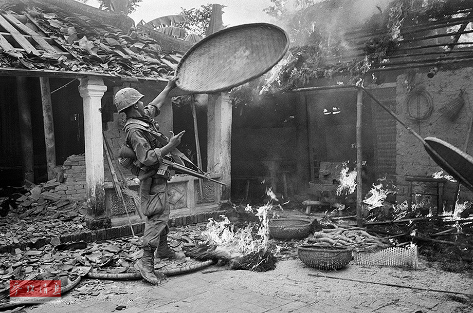 1967年10月27日,一名士兵将一个米框扔到火焰上,他们的部队横扫了这个位于三岐附近的村庄。一位妇女试着从燃烧的火焰中拿出这个篮子,但是美国部队试图摧毁一切对于越共有价值的东西。