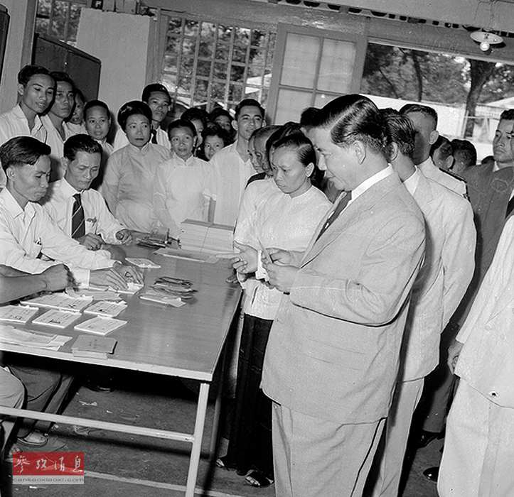 1959年8月30日,越南共和国第一任总统吴庭艳在西贡投票。当时,吴庭艳享有美国政治和军事支持,但是在1963年晚期,他的政府被推翻,并遭到了暗杀,失去了美国的支持。