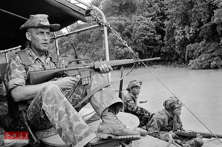 1964年6月,南越士兵和一位美国参谋在柬埔寨边境的小河上巡逻。