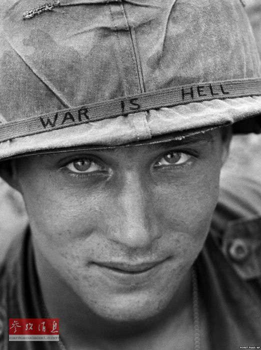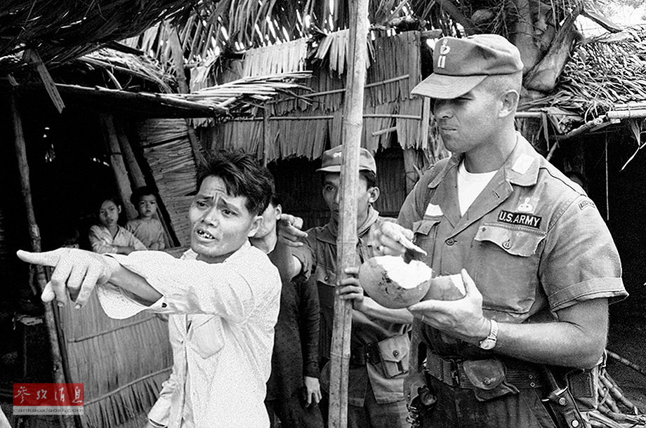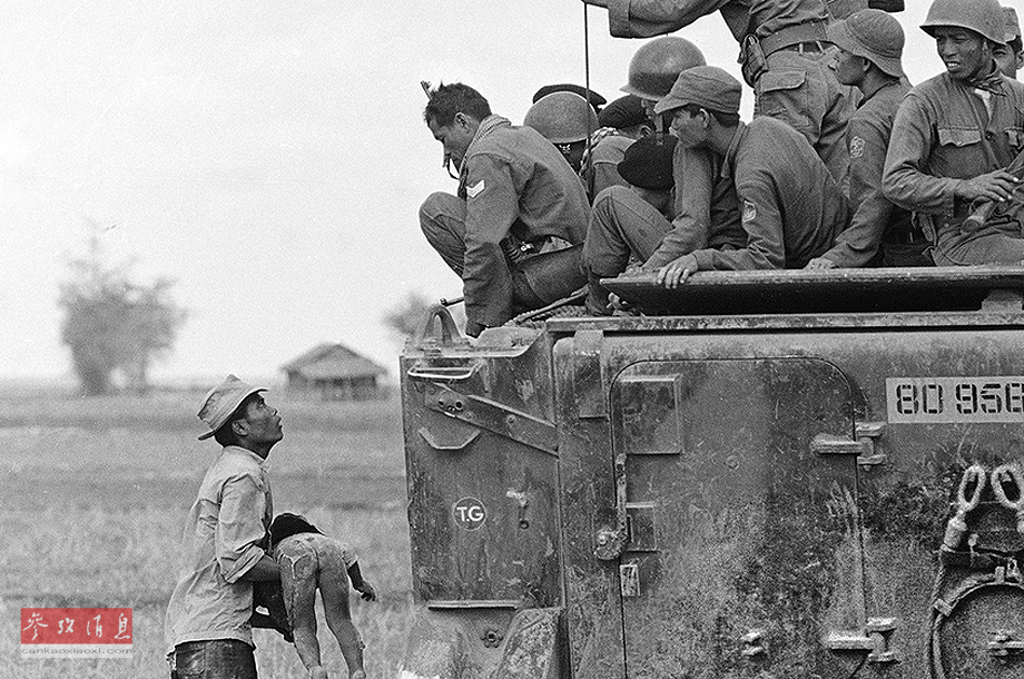 坐在装甲车上的南越陆军游骑兵看着一位父亲抱着孩子的尸体。1964年3月19日,他的孩子在政府武装追击游击队进入一个柬埔寨边界附近的村庄时被杀。越战是二战以后美国参战人数最多、影响最重大的战争,最后美国在越南战争中失败。