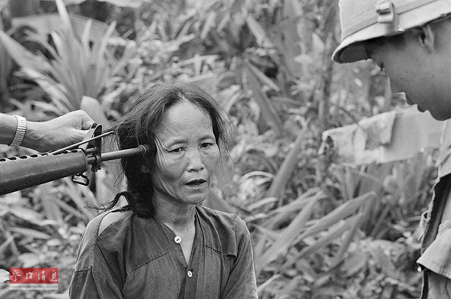 1967年11月,在三岐,一名越共人员正被南越警察用枪指着头盘问。
