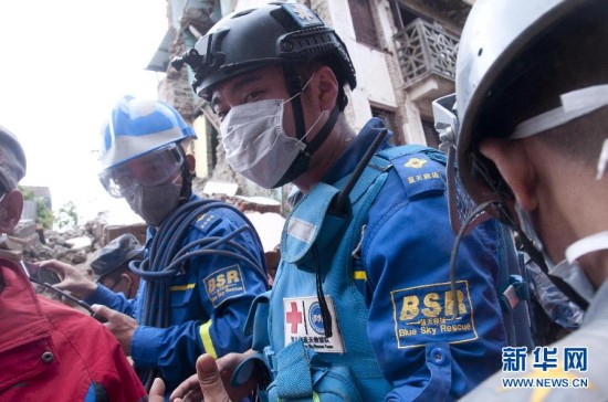 4月30日,在尼泊尔加德满都附近的桑库,中国蓝天救援队队员准备展开救援。据尼泊尔媒体30日援引尼内政部的最新消息,25日发生的强震目前已导致超过5000人死亡,约10000人受伤。新华社发(普拉塔普·塔帕摄)