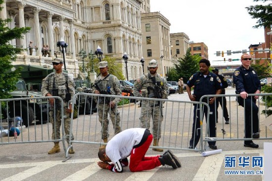 5月2日,在美国马里兰州巴尔的摩,一名男子跪倒在市政厅前。当日,巴尔的摩举行大规模集会,庆祝非洲裔青年弗雷迪·格雷致死案涉案美国警察被起诉并要求司法公正。集会从下午2点开始,数千人由弗雷迪·格雷居住的西巴尔的摩街区开始游行,最后汇聚到市政厅。新华社记者鲍丹丹摄