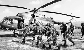 演习中,解放军特战队员快速登机。