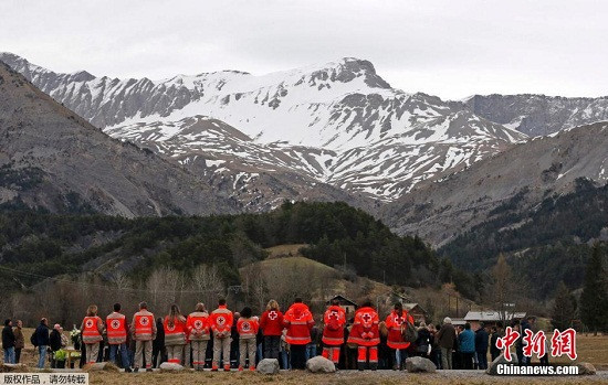 当地时间2015年3月28日,法国勒韦尔内,法国救援人员悼念德国之翼空难遇难者。
