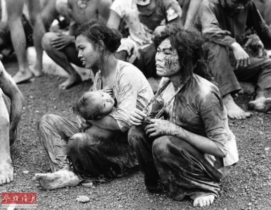 战争结束时给越南留下了一片满目苍夷的土地和100万孤儿、200万寡妇、50万残疾人。图为1965年6月6日,激烈战斗过后幸存的越南妇人和孩子。
