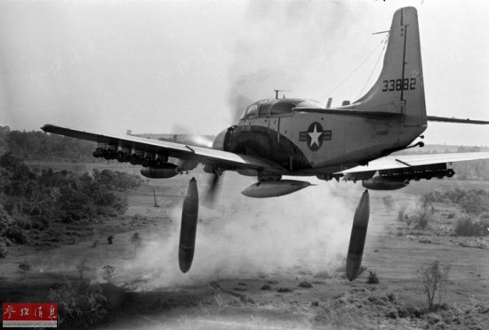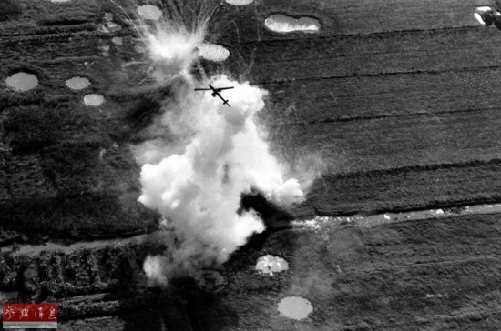 越南北方军民采取灵活机动的战术打击敌人,许多“战略村”被捣毁,一些“战略村”还变成了人民的战斗村。图为1964年12月26日,低空飞过的美军攻击机,向疑似越共军队活动区域投掷炸弹。