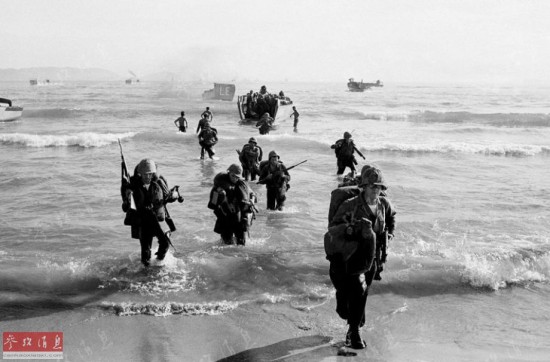 1965年3500名美国海军陆战队队员在越南共和国岘港市登陆,成为第一批进入战区的美国国防军战斗人员。图为1965年4月10日,美军携带装备从岘港附近登陆。
