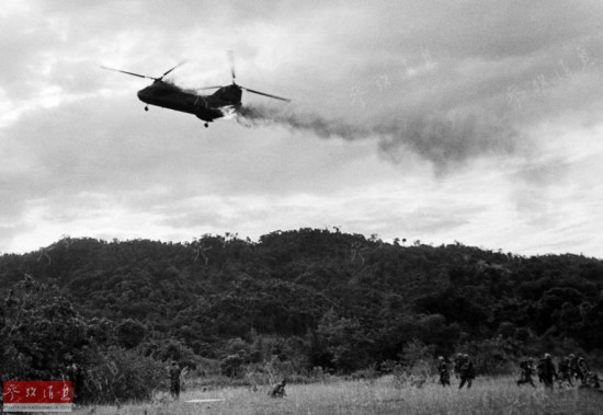 约翰逊下令采取“雷声隆隆”行动,在南越不再局限于使用傀儡军,美国直接派军队参战。侵越美军迅速增加,达到50万人。图为1965年3月,直升机悬停扫射可疑丛林,协助美军搜索前进。
