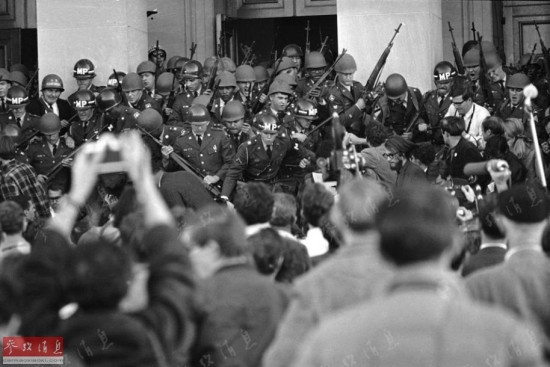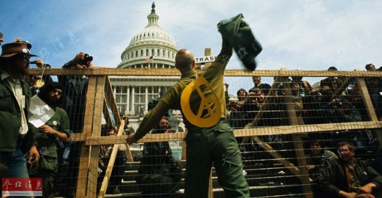 60年代最大规模的示威游行出现在华盛顿,参加学生人数达十万人之多。面对防暴警察和催泪瓦斯,示威者毫无畏惧,甚至有人冲上五角大楼前的升旗台,升起了越共的旗帜,以示对越战的抗议。图为1967年10月21日,反战人士冲击五角大楼。