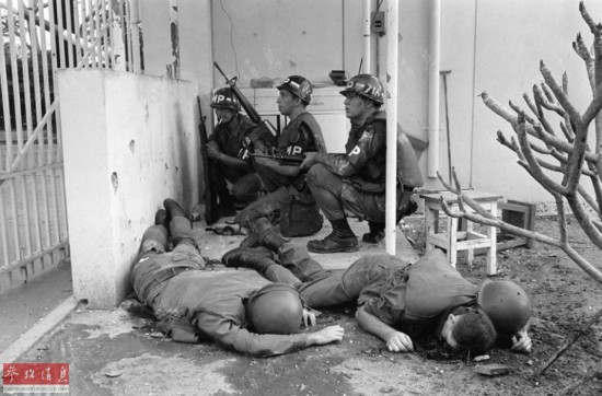 小股偷袭、恐怖袭击等战争方式被越共游击队大量使用。图为1968年,越共游击队袭击西贡的美国大使馆,美国军警在矮墙后面组织防守,旁边是战死的美国士兵。