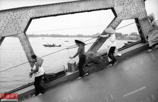 越南顺化,行人走在遭袭击坍塌的桥上。