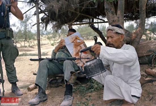 1967年9月,一位美军战士正在看一副性感女郎的画片,旁边的越南老汉正在煮茶。