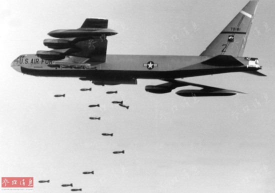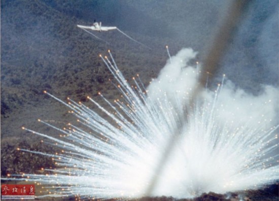 为了挽回一再失利的战事,美军不惜将很多惨无人道的大杀伤性武器投入到越南战场。图为1966年,美军战机投白磷弹轰炸越共军队藏身地。