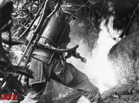 1967年4月14日,美军士兵向越共军队藏身地喷射火焰。