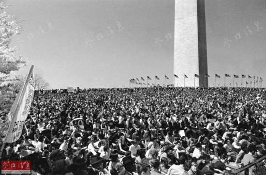 学生们在华盛顿举办全国性质的宣讲会,并向华盛顿进军。学生们提出从越南撤军的口号,他们在请愿书中写道:“我们相信对于升级的唯一选择是,美国从越南撤军。我们相信对于南越的民主和发展的唯一机会是,通过谈判解决战争。”图为1965年4月17日,成千上万的反战人士聚集在华盛顿纪念碑前,声讨白宫的越南政策,要求结束在越南的军事行动。