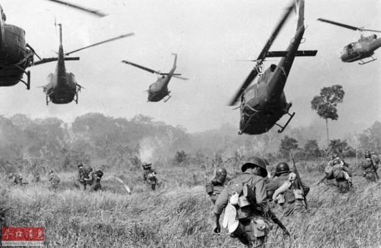 约翰逊政府把“特种战争”升级为“局部战争”,扩大战争规模,开始对越南北方的轰炸袭击。图为1964年12月,美军直升机低飞配合地面部队前进,随时准备支援地面部队打击北越游击队。