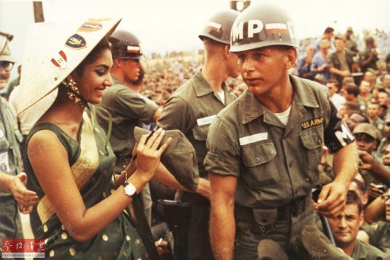 美国劳军组织(United Service Organizations Inc,USO)成立于1941年,与美国国防部合作,经过美国国会特许,主要职责是鼓舞美军士气。他们为招兵摇旗呐喊、到前线登台表演;电影名星、歌手、体育明星纷纷加入这一行列,堪称美国式的“宣传队”。下面这组图集将聚焦在越南战场上,各类明星到前线劳军,奉上一幕幕或香艳或狂野的表演。图为1968年,劳军女歌手与美国大兵亲密互动。