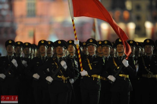 5月4日,在俄罗斯首都莫斯科,中国方阵参加彩排。新华社记者戴天放摄