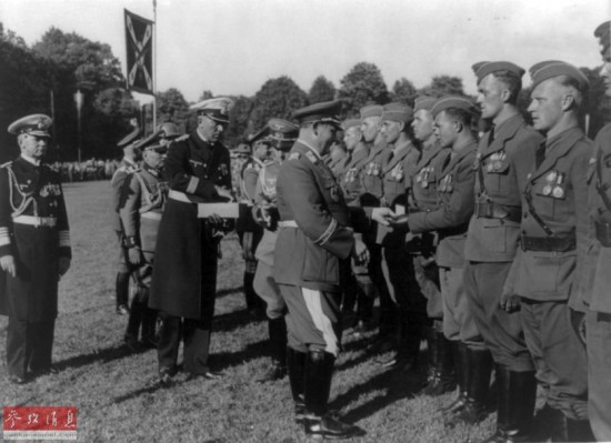 秃鹰军团一直参战到1939年4月战争结束。在高峰时期,德军兵力约有1.2万人,先后有1.9万德国人参与了西班牙内战。图为赫尔曼·戈林向秃鹰军团的德国飞行员授勋。