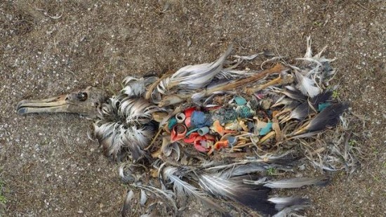 吃塑料而亡的信天翁:图中的信天翁因为无法消化误食的塑料而死亡。