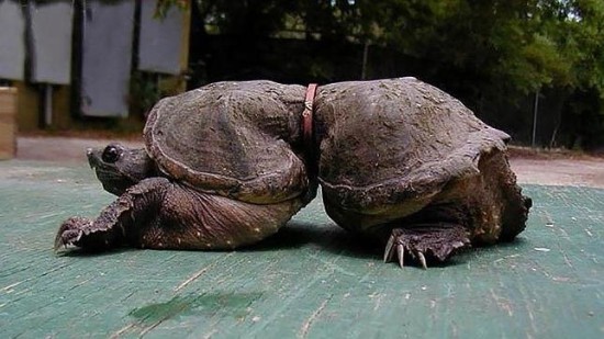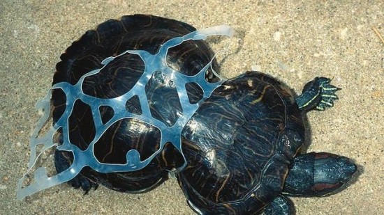 被塑料胶带捆绑的龟: 和第一张图一样,动物们可能会因为被困于某种废弃物中而发生身体畸形。一条塑料胶带捆住了这只龟,造成龟壳无法继续生长而变形。