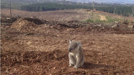 无家可归的考拉:动物们面临的另一个严峻威胁是其栖息地所在地区的乱砍滥伐。砍伐树木意味着动物们将失去居住地和食物,被迫迁徙。这只考拉站在一堆木头上,不知所措。一个澳大利亚的非政府组织救助了它。