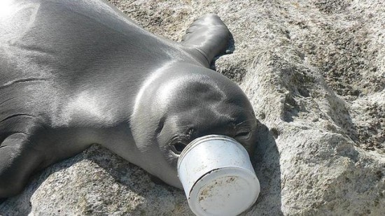 困于塑料容器的海豹:进入海洋的一个小小的瓶子或容器都可能变成动物们的夺命陷阱,就像这只海豹,它根本无法自行取下这个容器。没有人的帮助,它很可能会因为无法正常呼吸或张嘴进食而死亡。