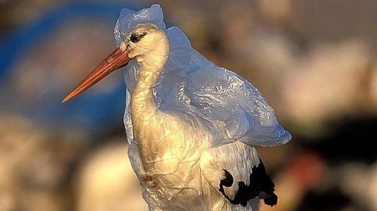 塑料袋中的鹳:一个小小的塑料袋在我们的日常生活中是再简单不过的东西,却可能变成动物们无法逃脱的牢笼,就像这只鹳。很多动物都面临着因为一个塑料袋而窒息死亡的危险。