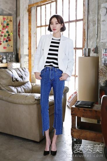 白色的清新大方总是让人无法抗拒,白色小西装简约知性,打破沉闷的职业造型,搭配条纹上衣和蓝色牛仔裤,简单又大方,裤脚处的不规则剪裁极具个性,让穿搭显得与众不同。