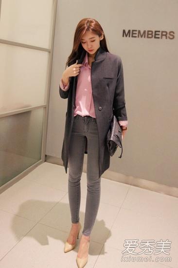 深灰色小西装外套,颜色经典大气,穿出优雅干练的气质,款式简洁修身,凸显利落感,搭配粉色衬衫增添女人味,配灰色小脚裤大秀长腿,脚踩高跟鞋更迷人。