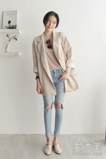 米色小西装颜色知性大方,穿出温婉气质,时尚的韩版设计,增添帅气个性的魅力,搭配米色T恤和浅蓝色小脚裤,有种怀旧的味道,牛仔裤的破洞元素给整体增添时髦感。