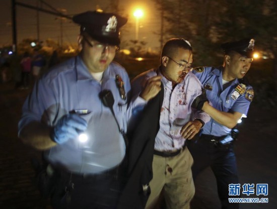 5月12日,在美国费城附近发生火车出轨事故的地点,救援人员转移一名受伤的乘客。据美国媒体12日报道,一列火车当天在美国费城附近出轨,造成一些人员受伤,具体受伤情况不详。 新华社/美联